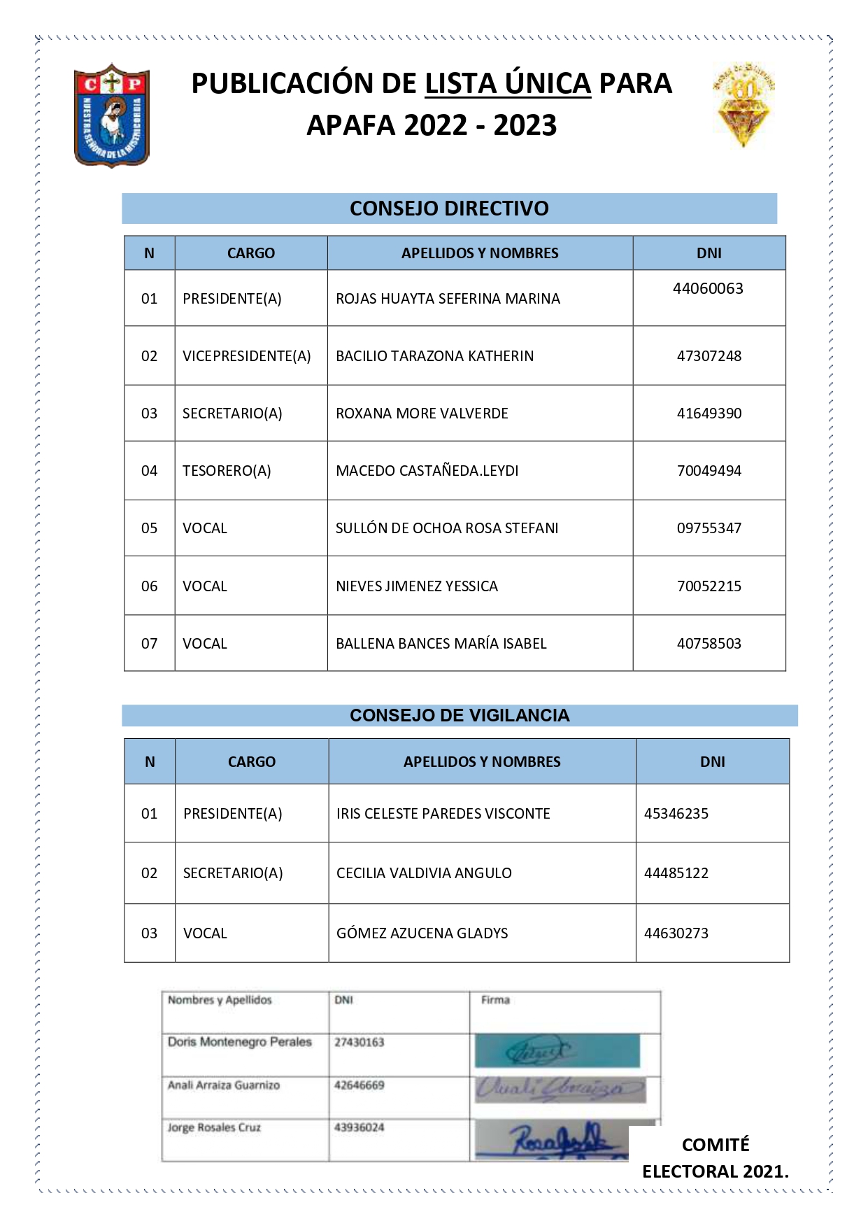* Publicación de ÚNICA LISTA HABILITADA